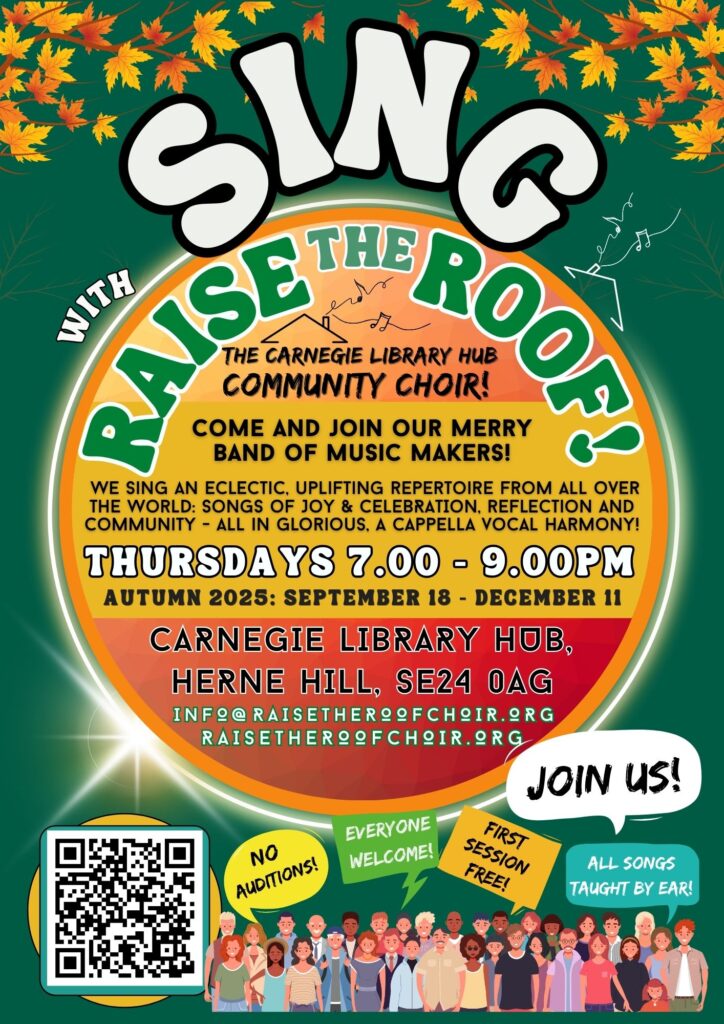 Raise the Roof meets on Thursdays evenings during ‘term-time. The doors open from 6.45pm and we sing from 7.00pm, with Tea and biscuit break at 8.00pm! ☕️ The second half is from 8.15 pm – 9.00 pm.